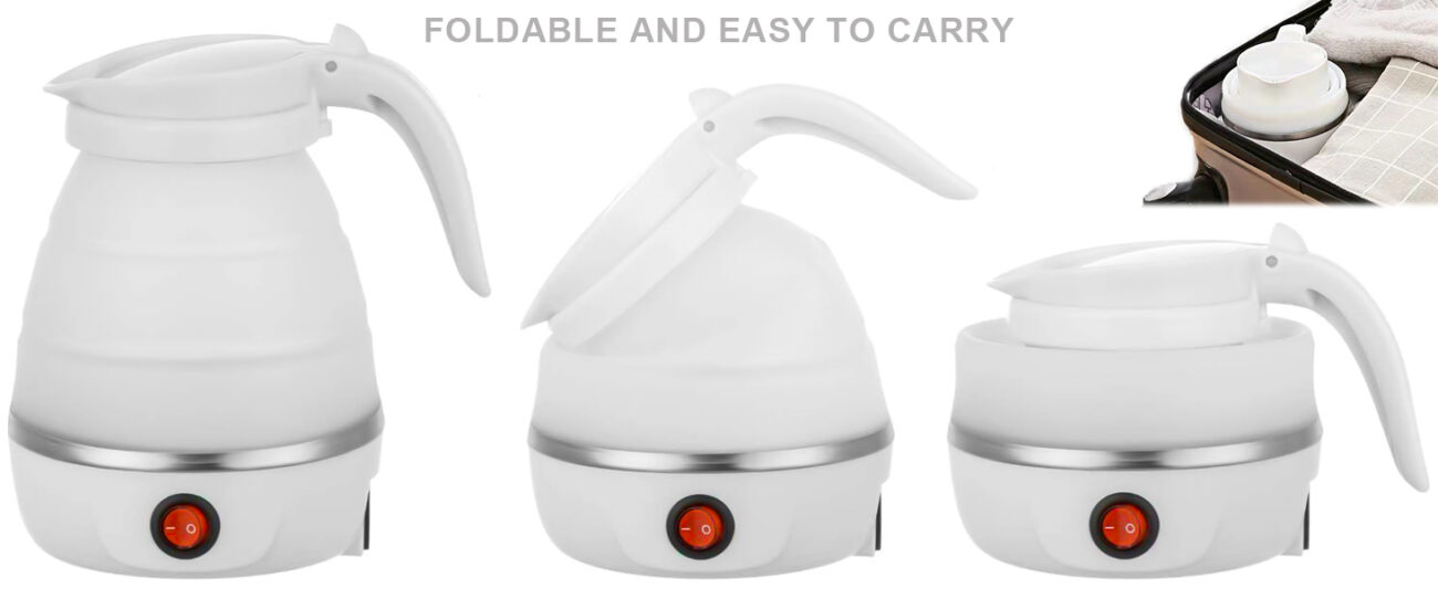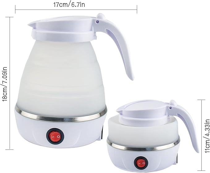 • Bouilloire pliable de volume 0,6 l dispose d’un design élégant et pliable. La hauteur avant le pliage est d’environ 18,5 cm. Une fois pliée, elle ne représente que 11,5 cm.