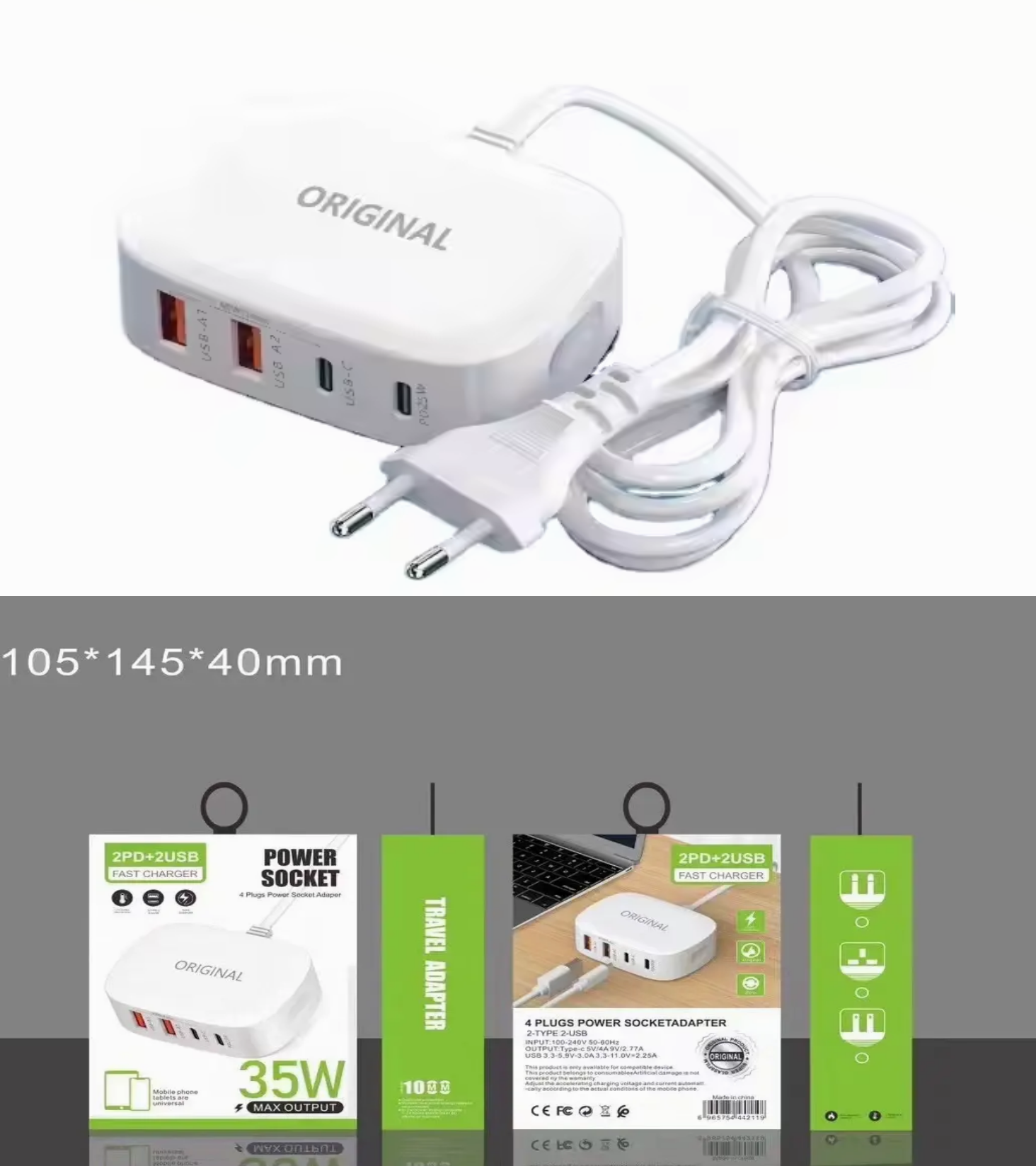 chargeur de téléphone 2 ports Usb + 2 ports type C Fast