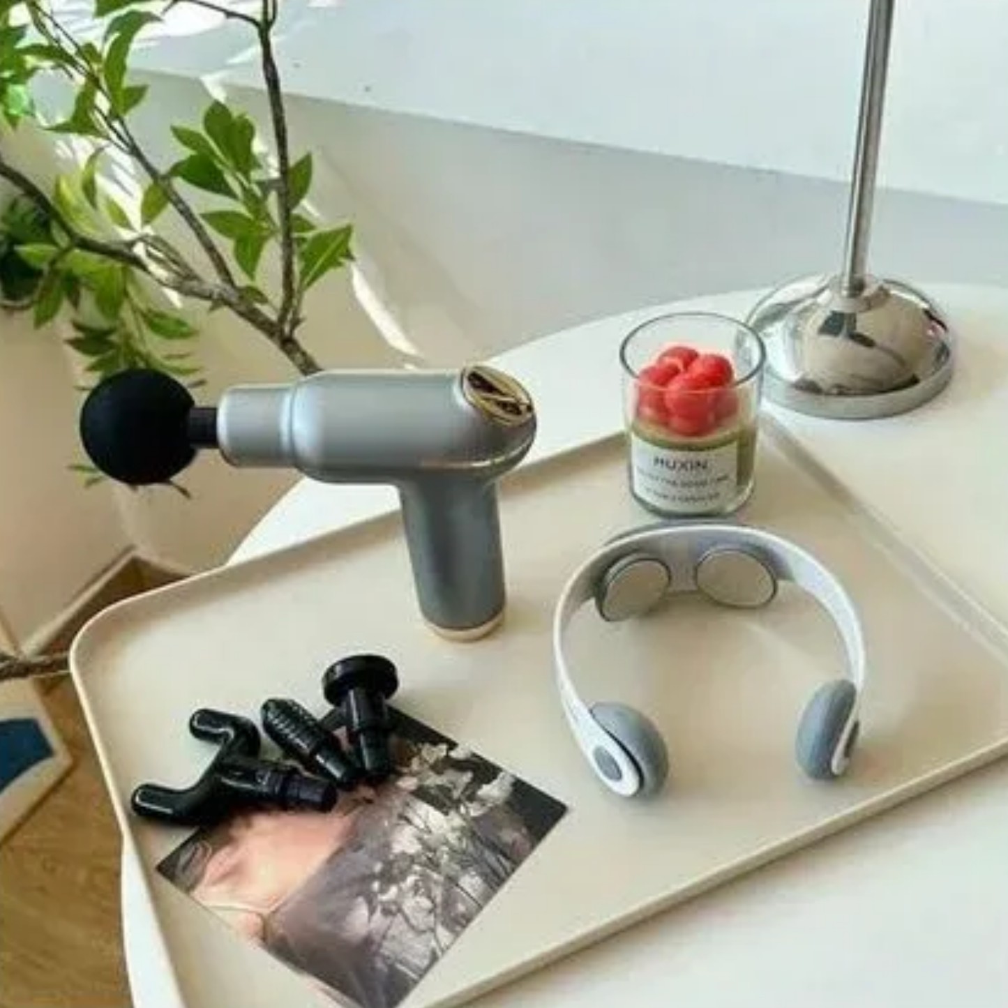• Pistolet de massage à percussion, design léger, avec étui de transport et manuel d’utilisation.