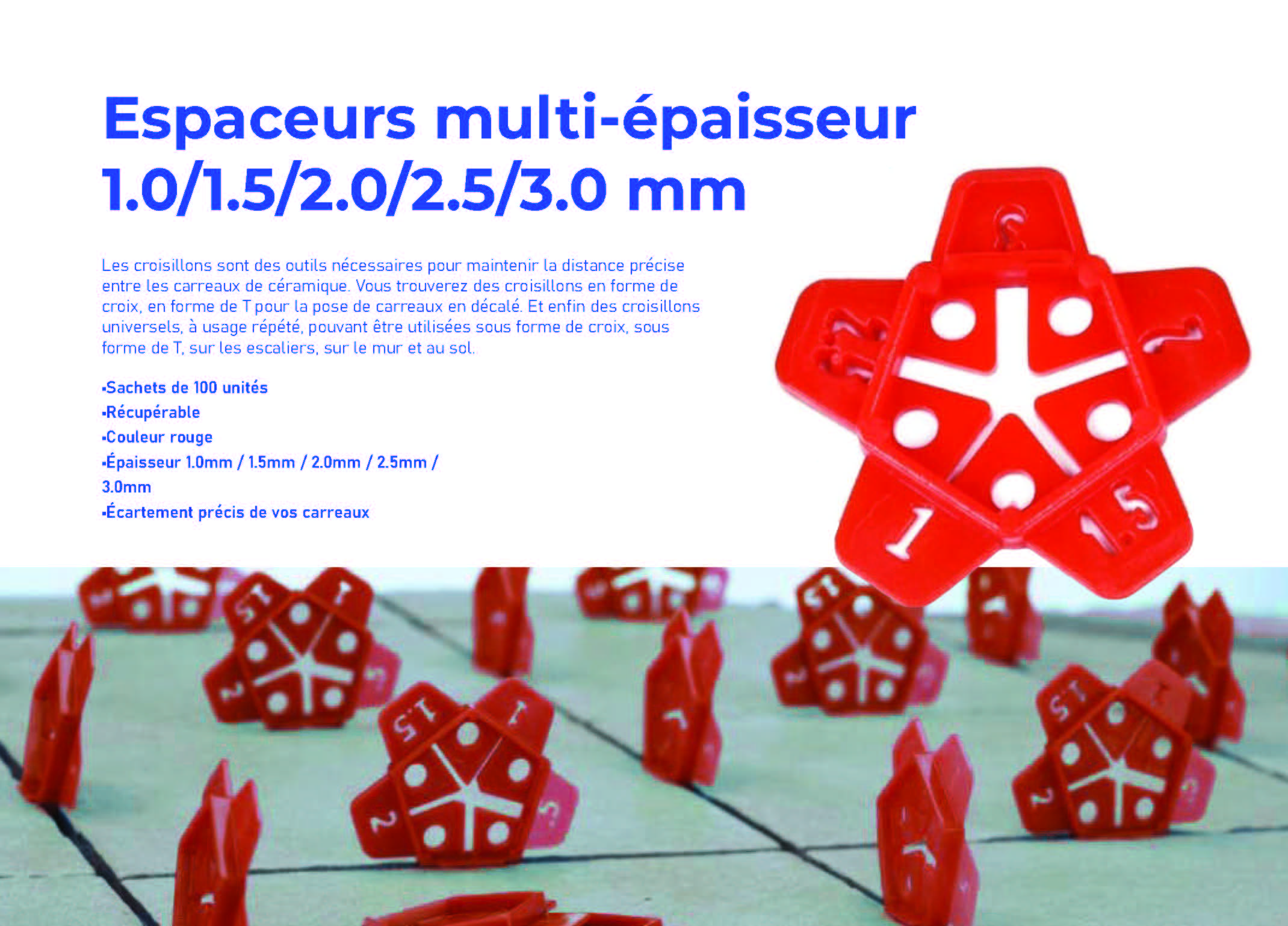 PACK 100 Entretoises de carreaux multi taille réutilisables (Croisillon de carreaux)