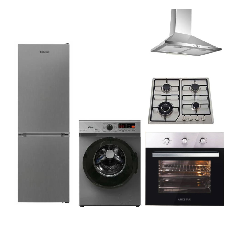 Pack de mariage 5 pièces : Réfrigerateur No-Frost Telefunken + Machine à laver 7kg Orient + Pack encastrable Auxstar Inox 3 pièces