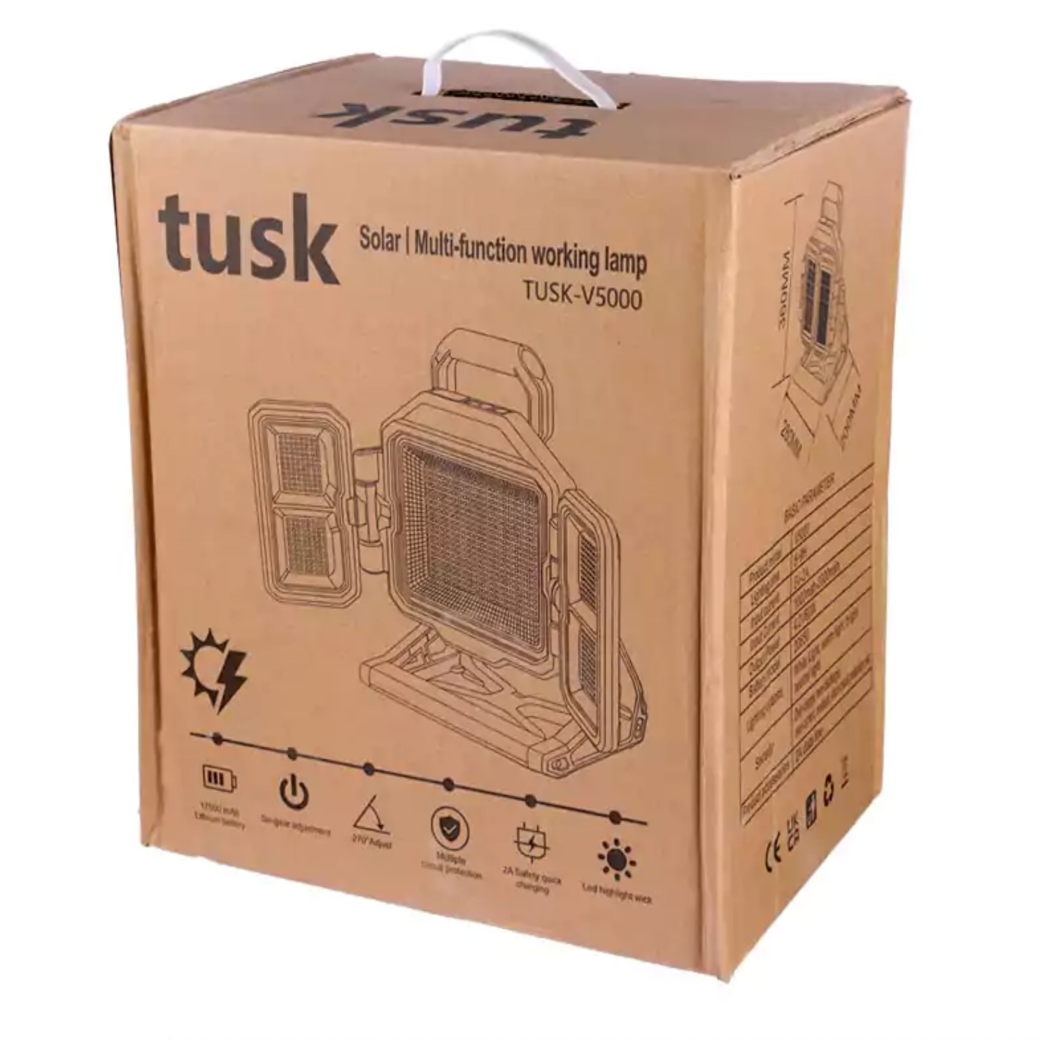 - Le projecteur solaire rechargeable Tusk -V5000 attire l’attention par son design unique. Ce projecteur est durable dans différentes conditions environnementales grâce à l’utilisation d’un matériau de corps ABS durable.