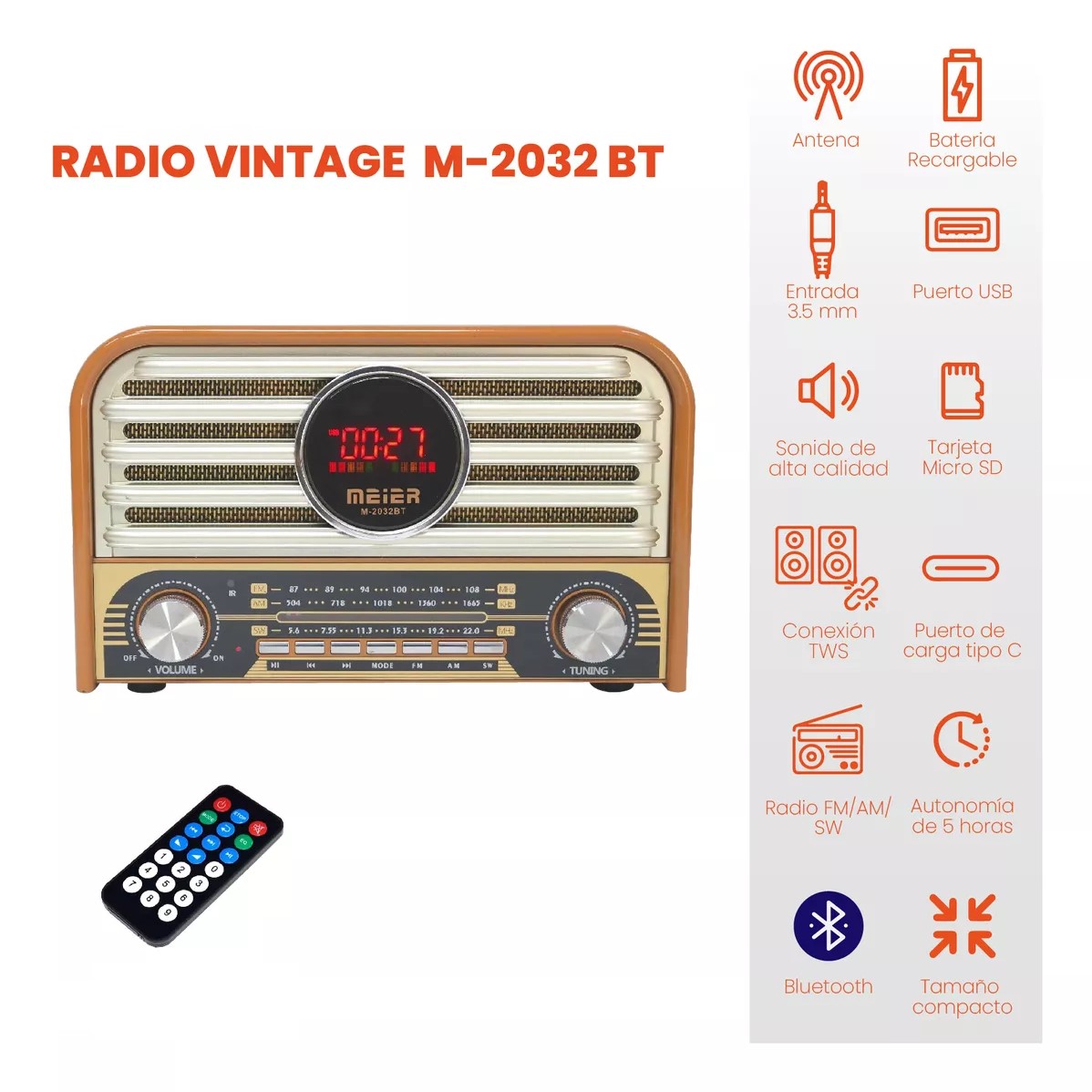 Meier M-2032BT Portable 3-Band Radio AM FM Sw, Carte TF et MP3 Lecteur, Haut-parleur Rechargeable, Design Rétro Bluetooth Télécommande
