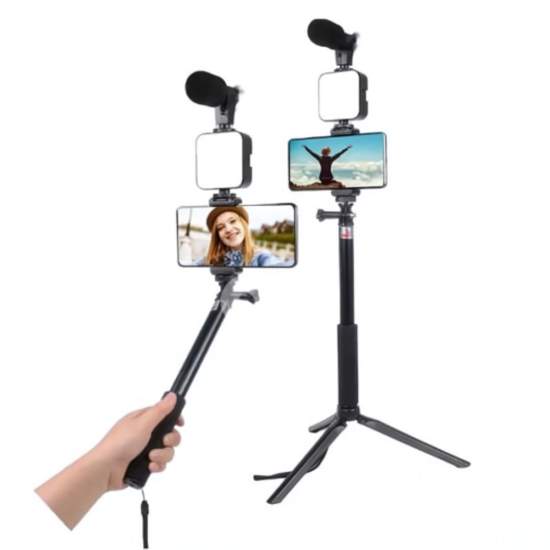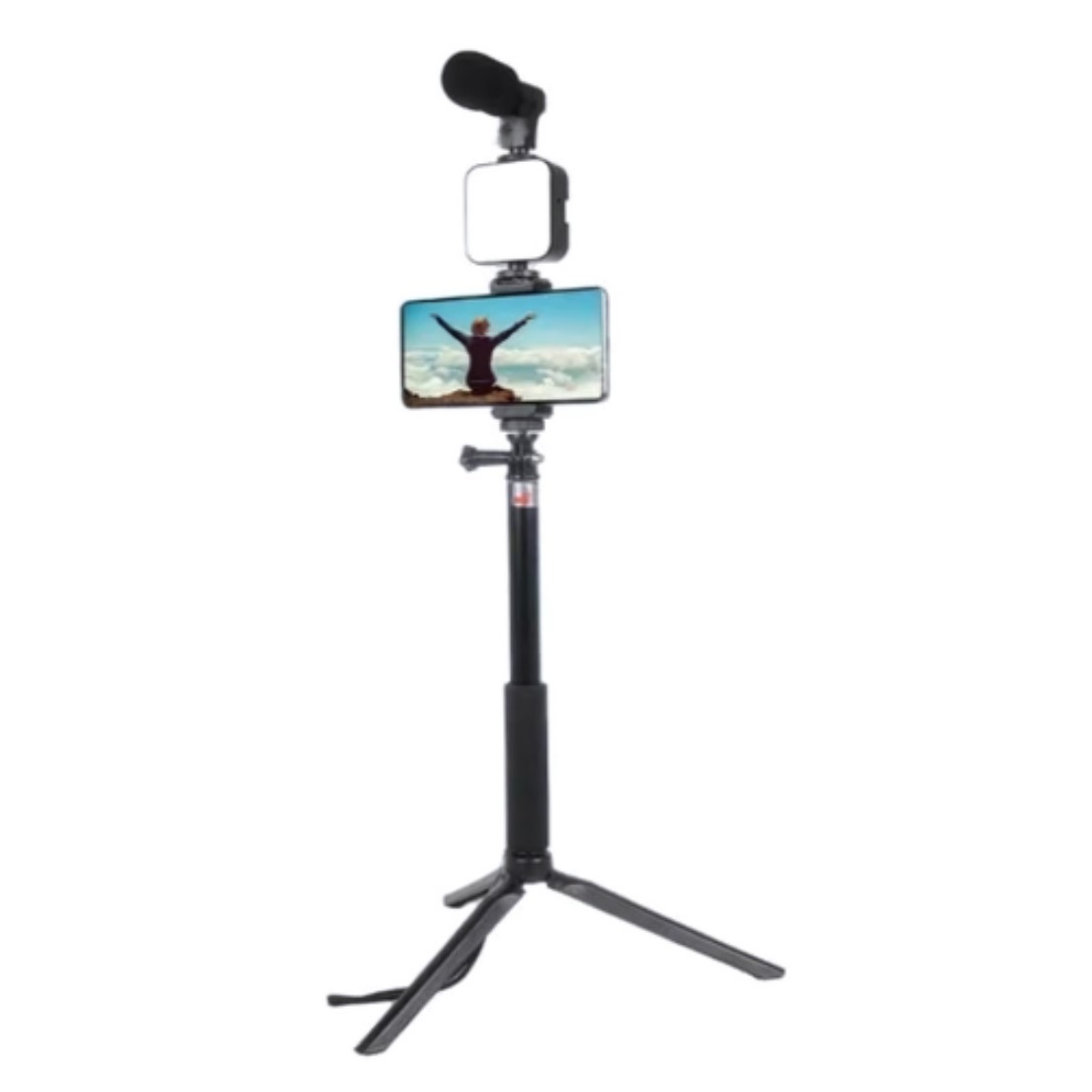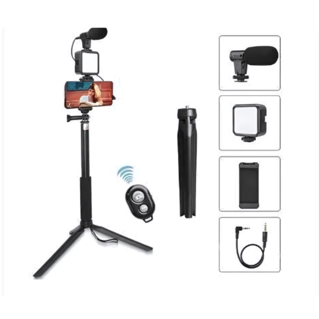 - Kit photographie et vidéo vous avez tout en 1, le trépied est idéal pour l’utiliser comme selfie stick, il dispose d’un support pour téléphone portable, d’une lumière et d’un microphone, ainsi que d’un contrôle pour prendre des photos à une certaine distance.