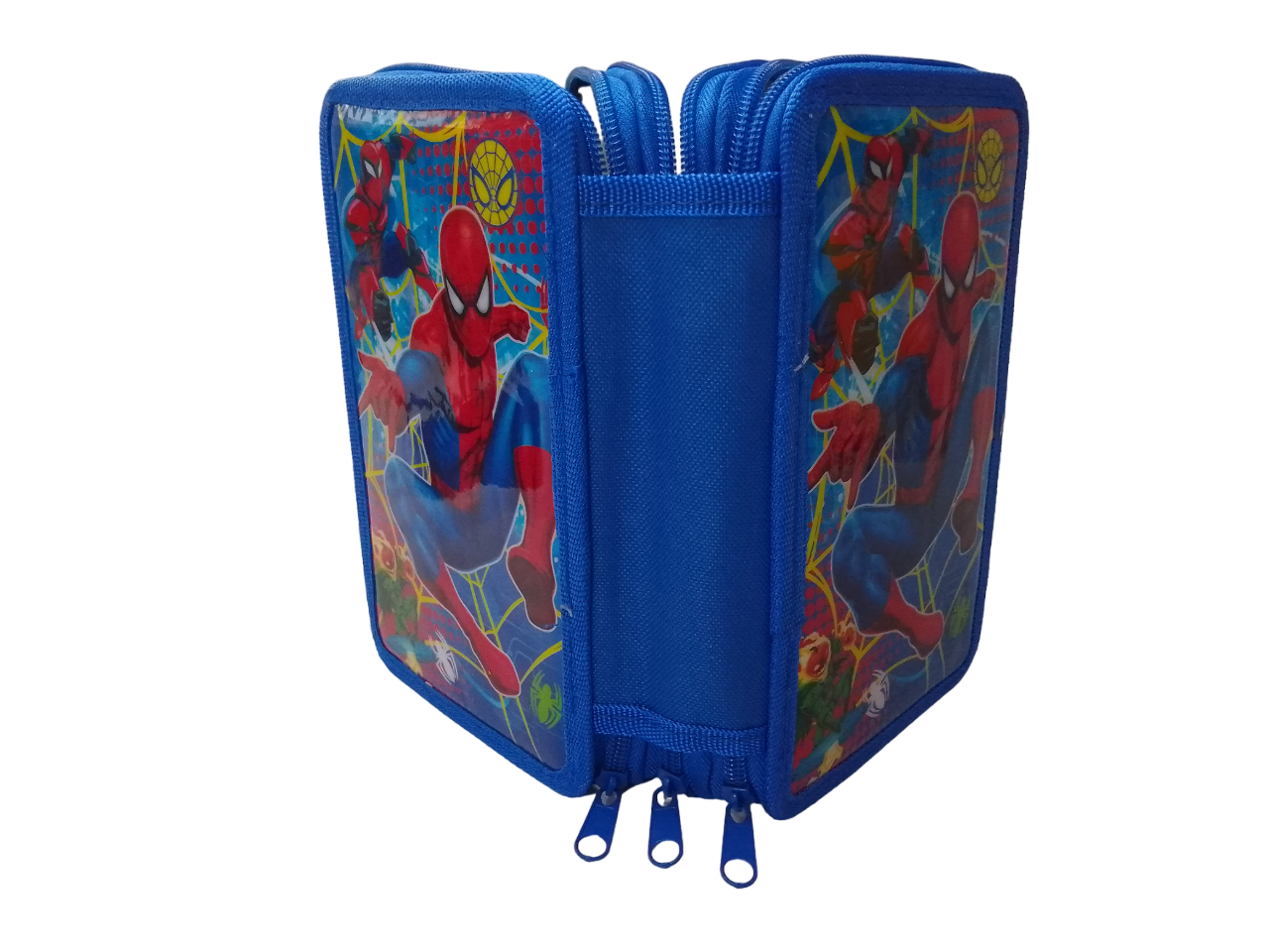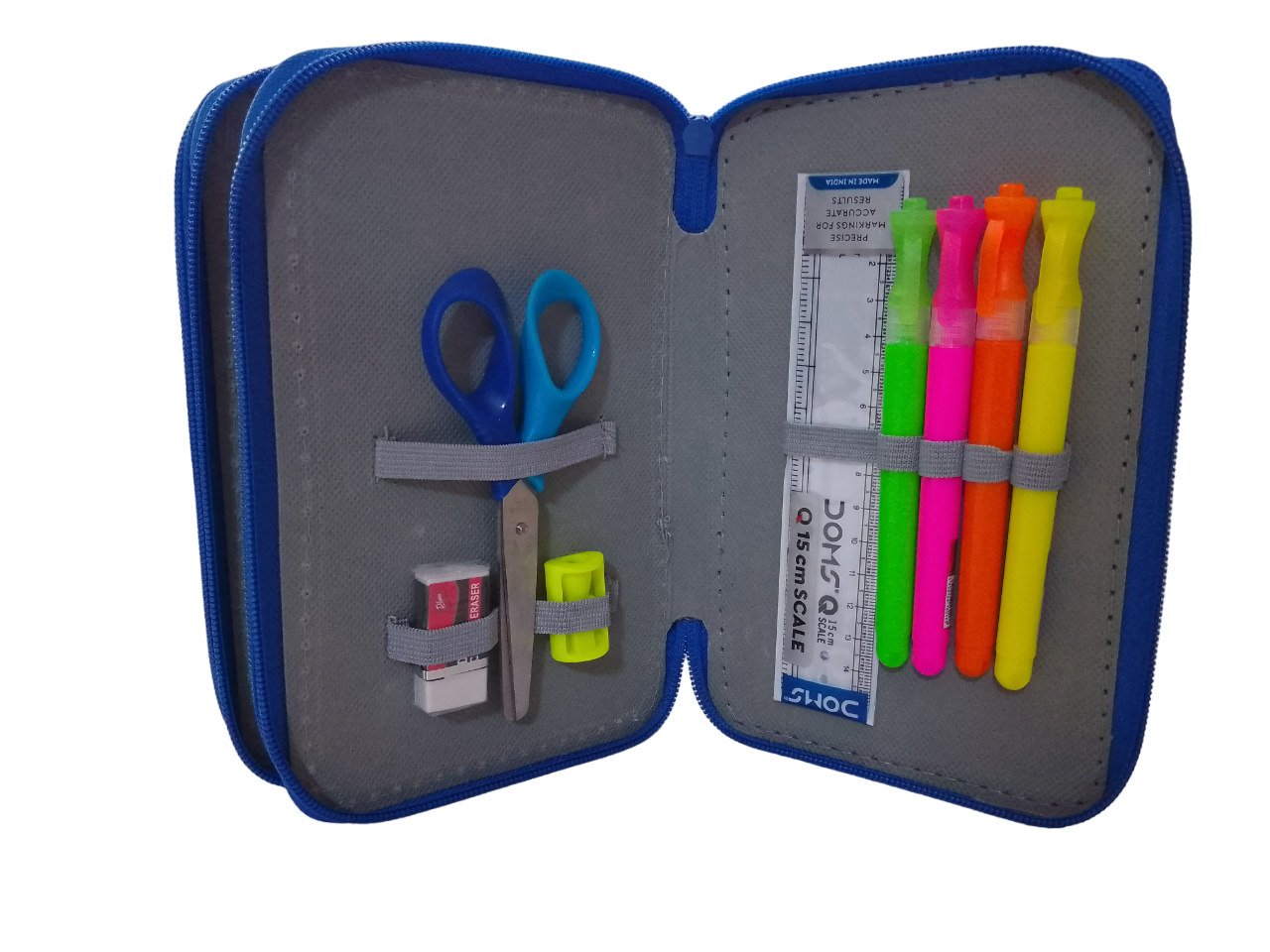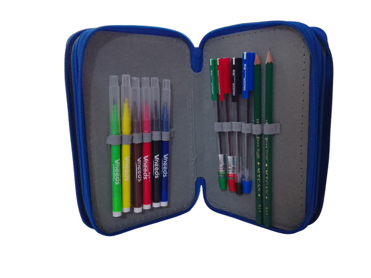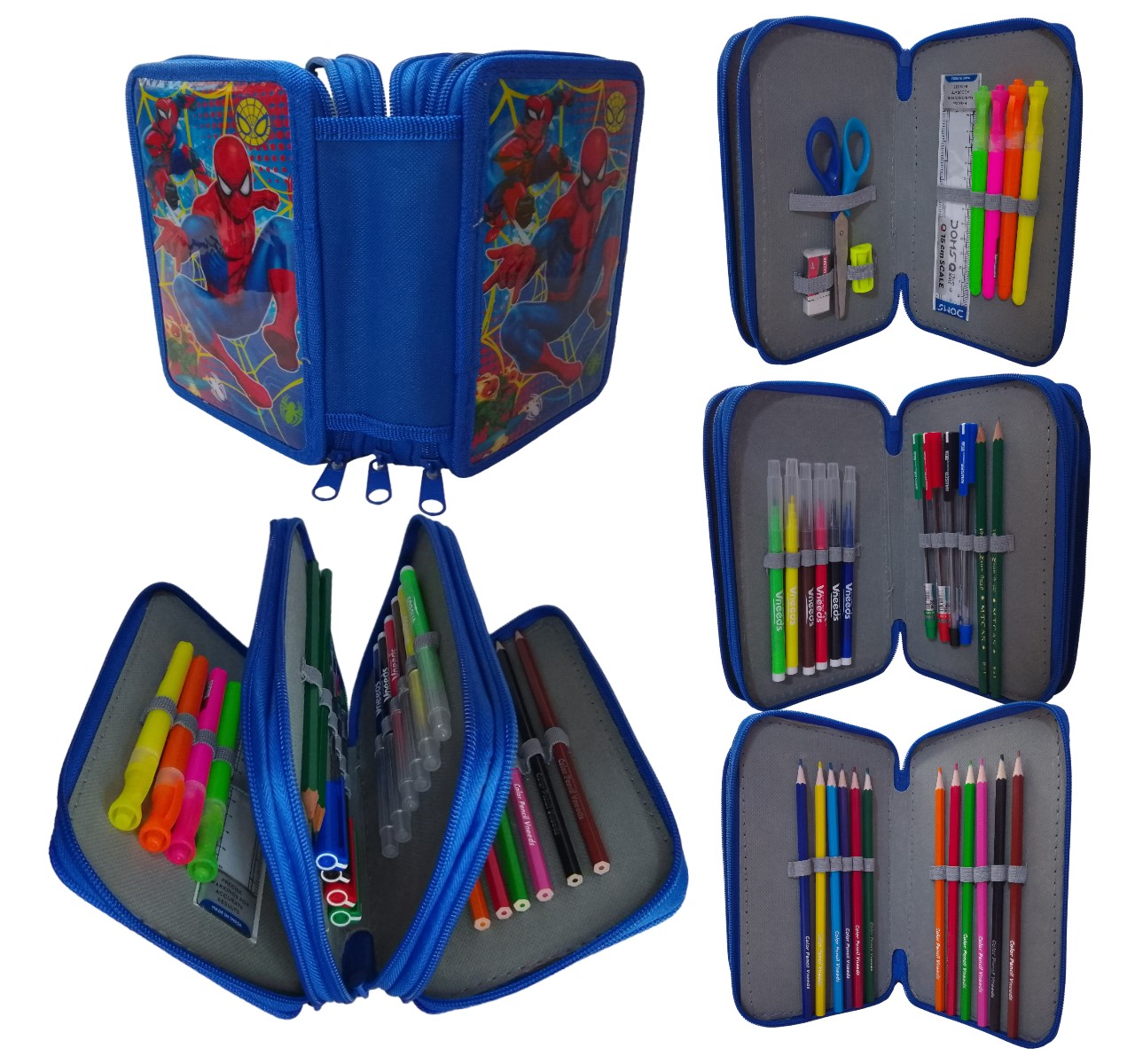 Trousse étudiante – Trousse enfant – Trousse scolaire : Trousse à crayons pliable avec fermeture éclair. Le dossier est divisé en trois départements de stylos différents et un séparateur. Contenu : – 12 Craies – 6 Feutres – 2 Crayon – 1 Gomme – 1 Taille-crayon – 1 Règle – 4 stylos à bille – 4 feutre fluorescent- – 1 Paire de ciseaux